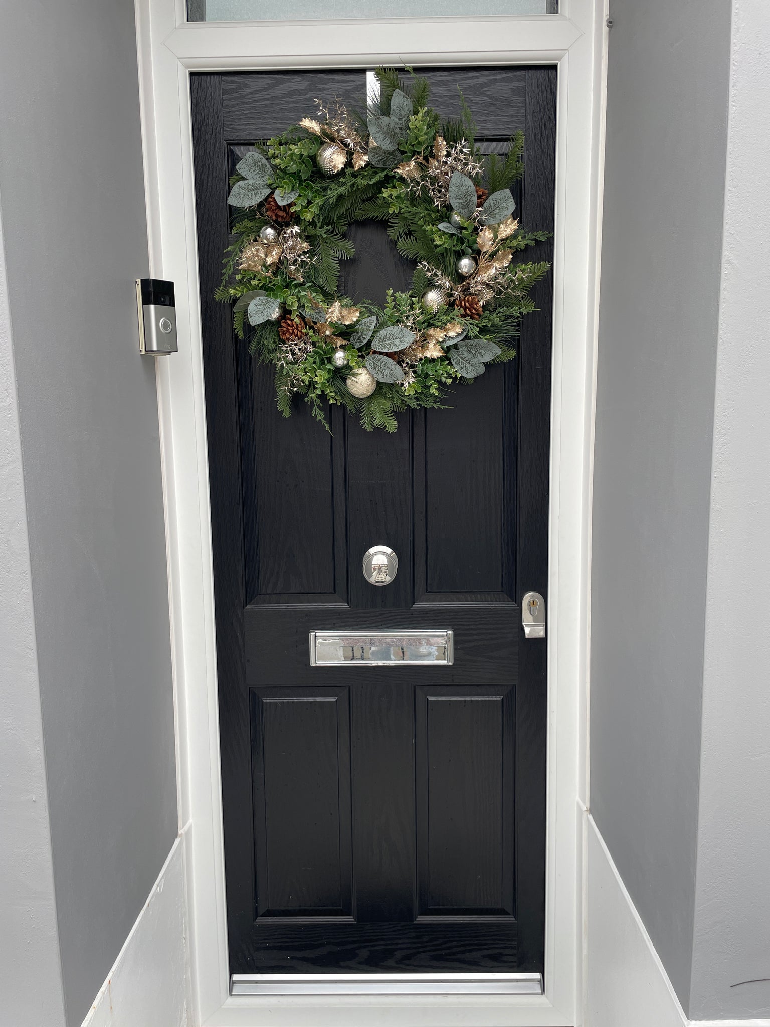 Large Artificial Christmas Spruce Wreath with Pinecones and Baubles in green and gold. 60cm in diameter